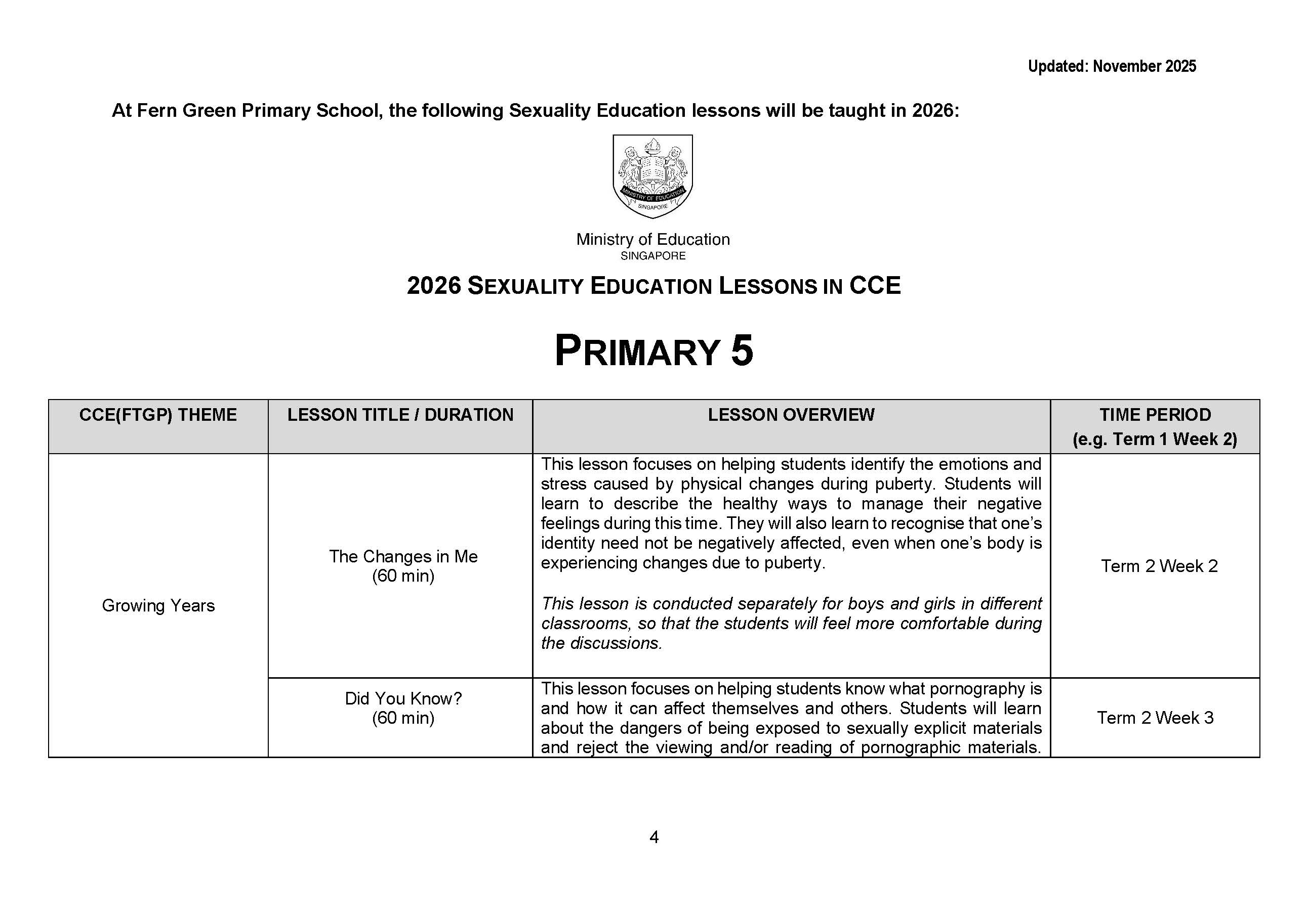 Parents can contact the school at (68343100 or email (ferngreen_ps@moe.edu.sg) for discussion or to seek clarification about the school’s Sexuality Education programme.