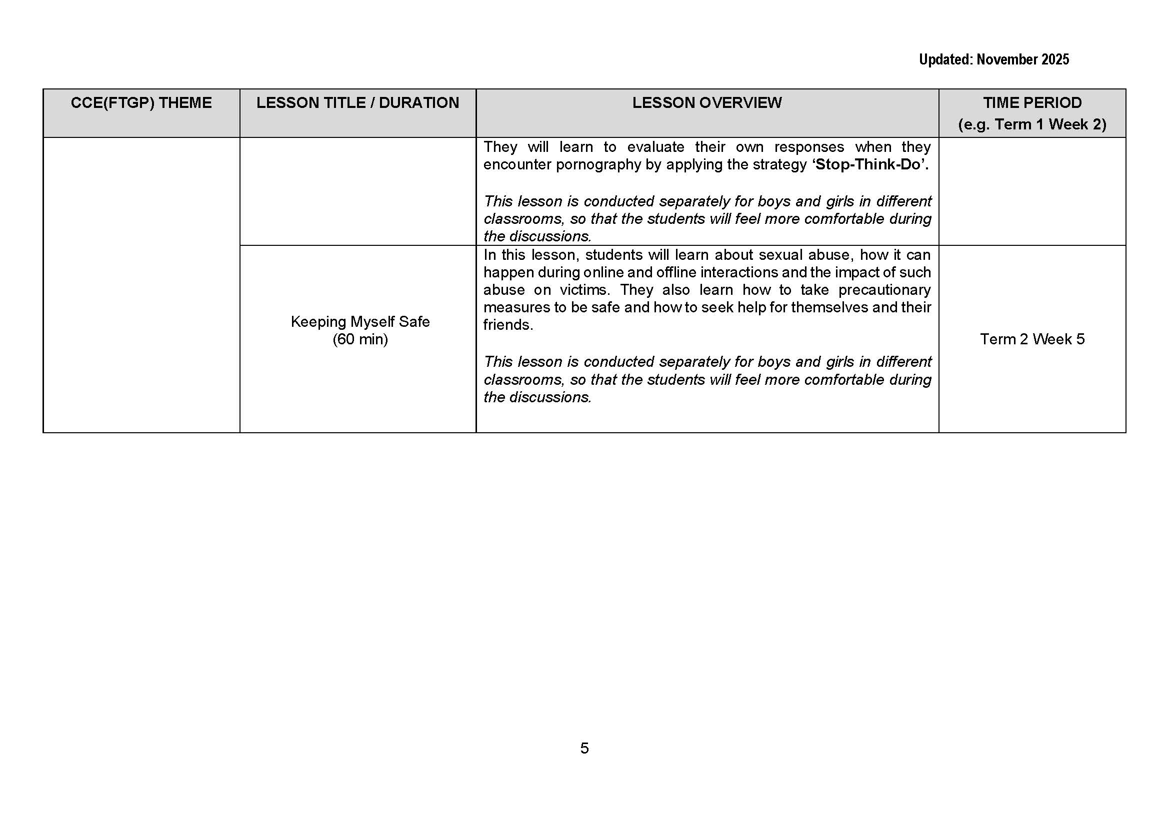 Sexuality Education (SEd) lessons are taught as part of CCE (FTGP) at Primary 5 and 6. Through these lessons, students will learn healthy ways to manage the physiological, social and emotional changes in their growing years. They learn to build healthy and rewarding relationships with others, including those with members of the opposite sex. Students are also guided to make wise, informed and responsible decisions to keep themselves safe from sexuality-related risks.